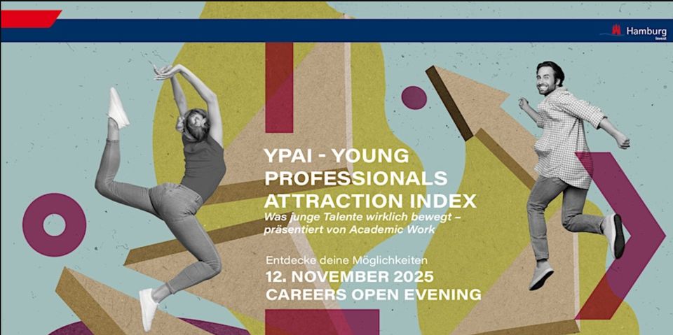Der Young Professionals Attraction Index (YPAI) – präsentiert von Academic Work. Erfahre aus erster Hand, was junge Talente in Hamburg und weltweit begeistert und wie du dieses Wissen für deine persönliche Karriere nutzen kannst. Du erhältst exklusive Einblicke, die dich bei deinen nächsten Karriereschritten unterstützen. Diskutiere mit Academic Work und den teilnehmenden Unternehmen, ob die Erkenntnisse der Studie deine Ansichten widerspiegeln, und entdecke in Gesprächen die aktuellen offenen Stellen.