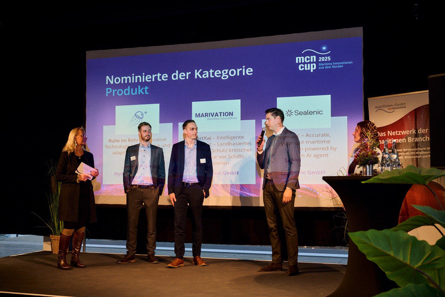 In der Kategorie „Produkt“ siegte die Marivation GmbH aus Oldenburg (Niedersachsen) mit ihrem maritimen Assistenzsystem SmartKai. Das System dient dem Schutz kritischer Infrastruktur vor Schiffskollisionen, indem es die Schiffsführung bei kritischen Hafen- und Schleusenmanövern von der Landseite aus digital unterstützt. Die Lösung funktioniert ohne zusätzliche Installation an Bord. Weitere Nominierte in dieser Kategorie waren die Rostocker Hydronauten GmbH mit einer innovativen Lösung zur Schwingungsdämpfung von Pumpen sowie die Sealenic GmbH aus Berlin mit ihrem KI-gestützten integrierten Informationssystem für die Schifffahrt.