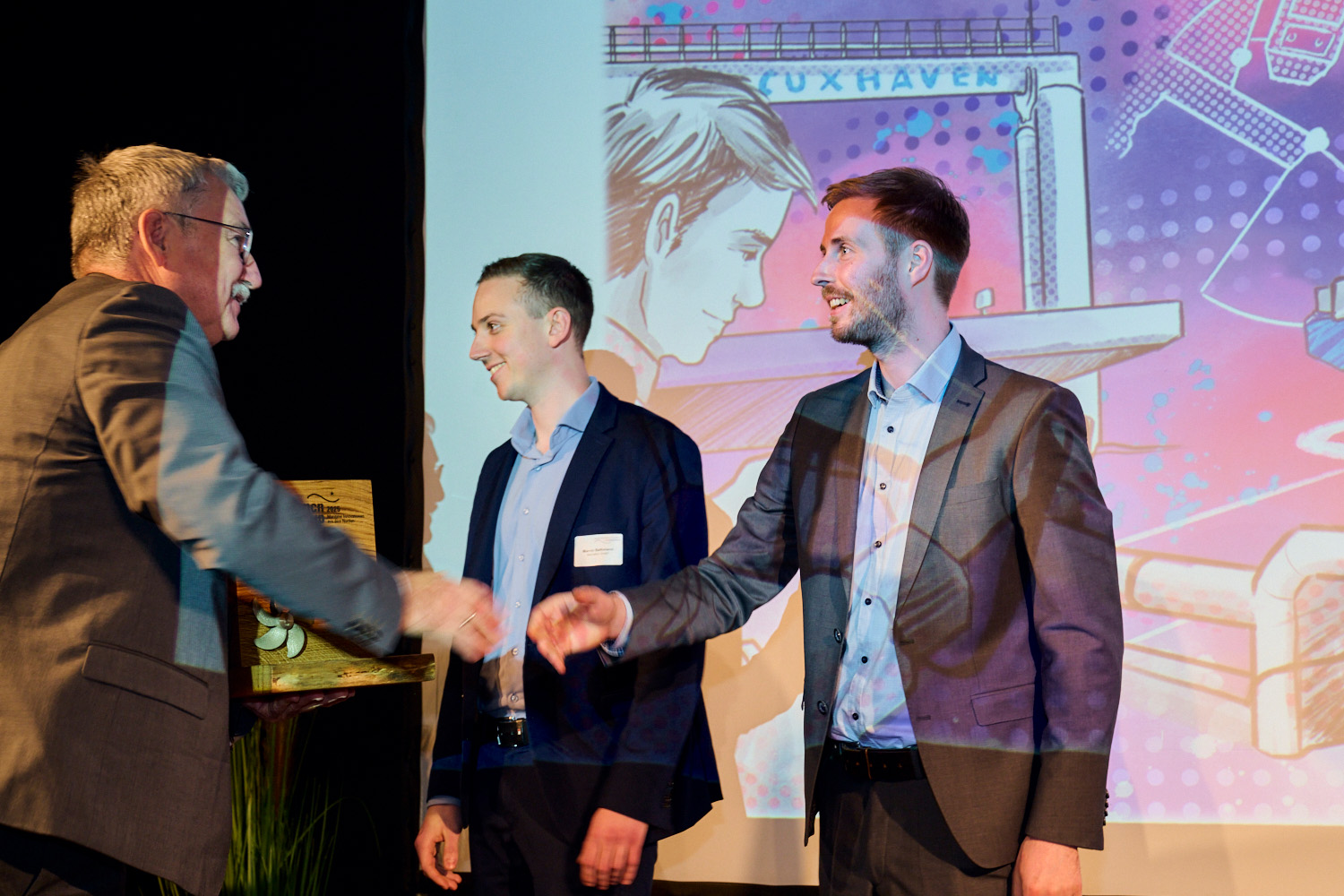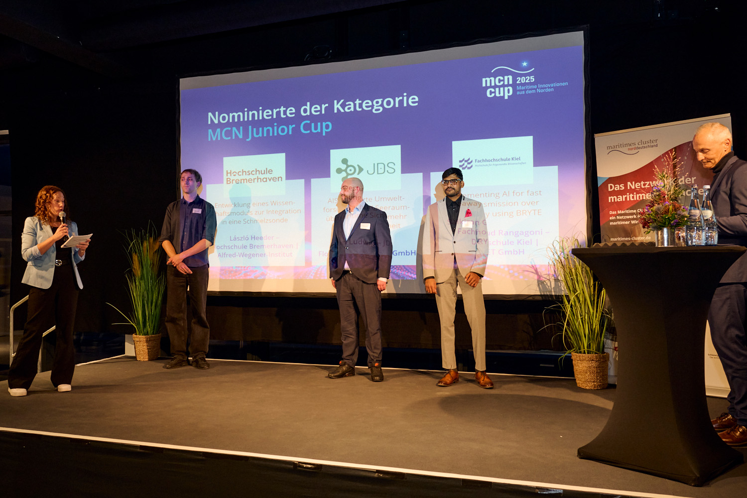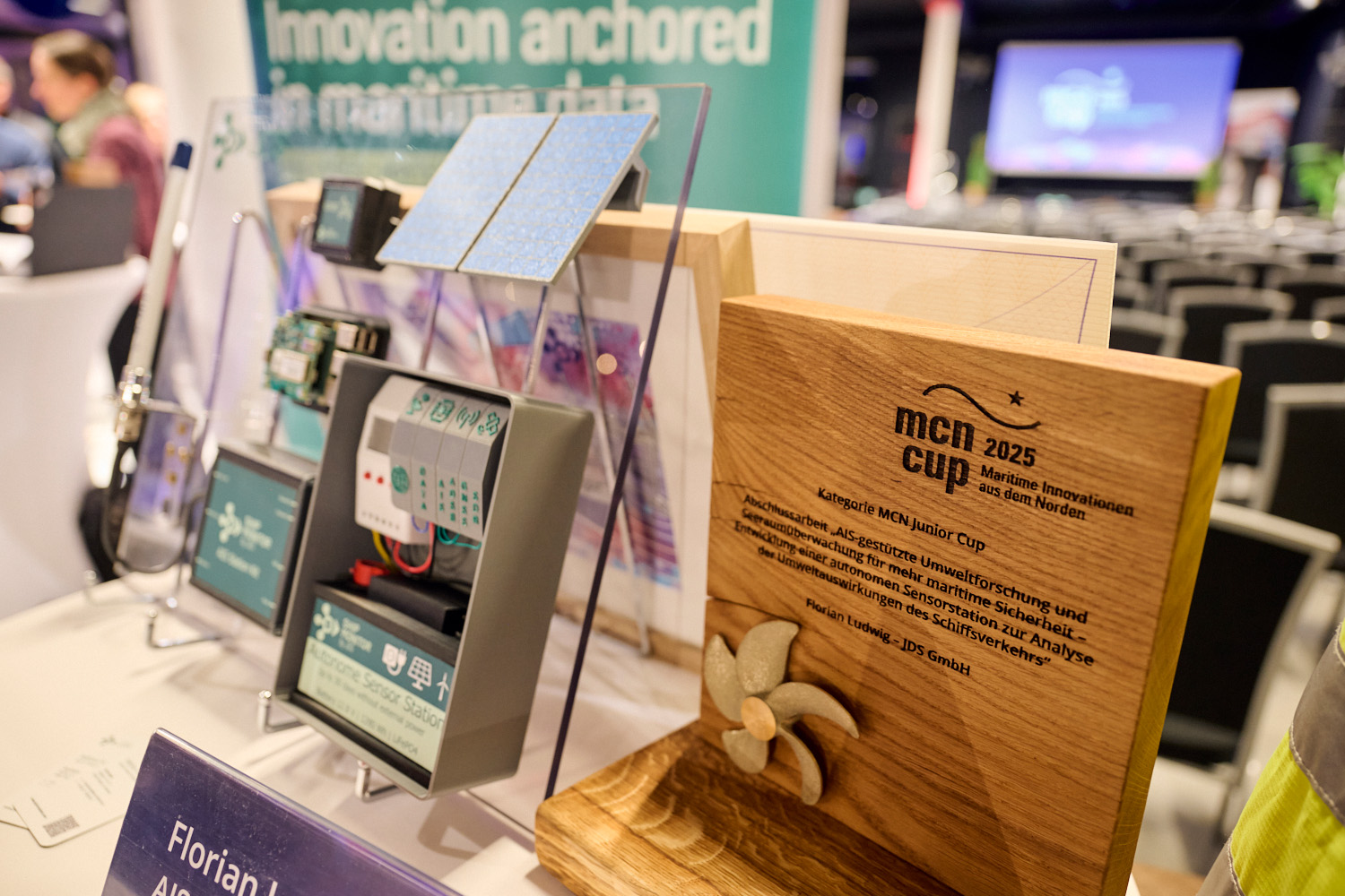 Vierte Kategorie des diesjährigen Wettbewerbs war der MCN Junior Cup. Hier gewann Florian Ludwig von der Rostocker JDS GmbH den Preis für seine Abschlussarbeit „AIS-gestützte Umweltforschung und Seeraumüberwachung für mehr maritime Sicherheit – Entwicklung einer autonomen Sensorstation zur Analyse der Umweltauswirkungen des Schiffsverkehrs“. Auch in dieser Kategorie gab es zwei weitere Nominierte, die dicht auf den Preisträger folgten: László Heeder (Hochschule Bremerhaven/Alfred-Wegener-Institut) war mit seiner Bachelorarbeit über die Einbettung eines Wissenschaftsmoduls in eine Schmelzsonde für den Einsatz unter extremen Wetterbedingungen positiv hervorgestochen. Außerdem beeindruckte Saikiran Goud Rangagoni (Fachhochschule Kiel/Drynet GMBH) mit seiner Masterarbeit über ein KI-basiertes System zur Optimierung der Datenübertragung auf See.