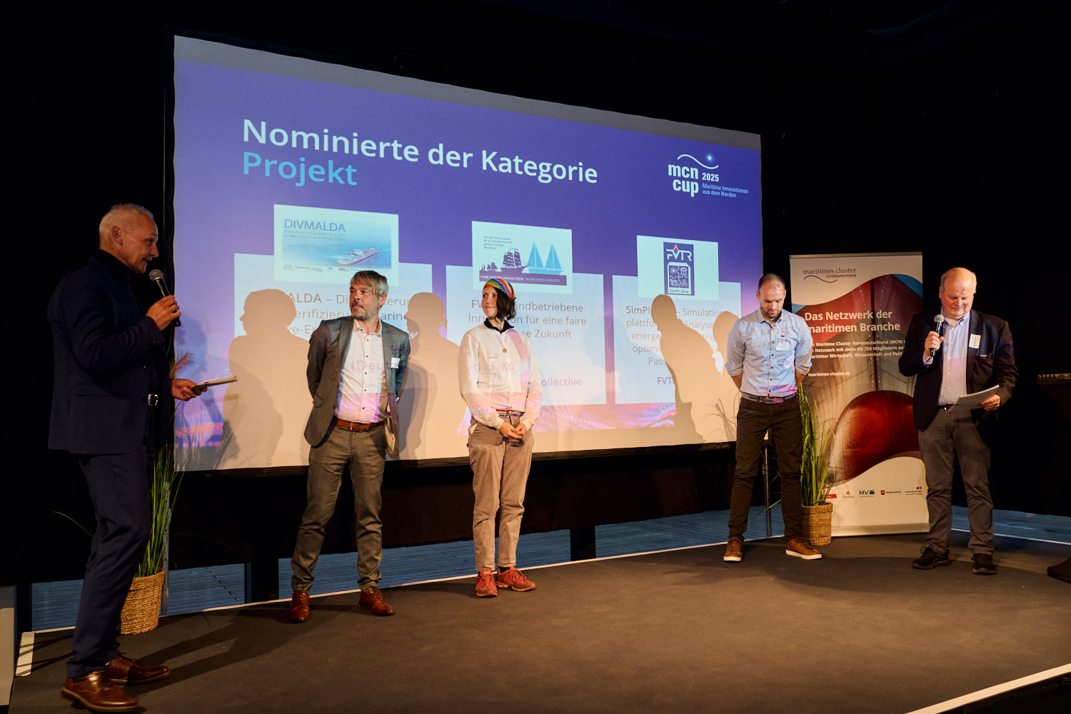 Den MCN Cup in der Kategorie „Projekt“ gewann der Rostocker Forschungsdienstleister FVTR GmbH für seine Simulationsplattform SimPleShip zur Analyse und energetischen Betriebsoptimierung komplexer Passagierschiffe mit Hilfe eines digitalen Zwillings. Ebenfalls nominiert in dieser Kategorie waren die Endress+Hauser (Deutschland) GmbH+Co. KG aus Weil am Rhein für das von ihr entwickelte, digitale Emissionsreporting DIVMALDA sowie das Netzwerk Fair Winds Collective, das nachhaltige Transportlösungen mit segelnden Frachtschiffen fördert.